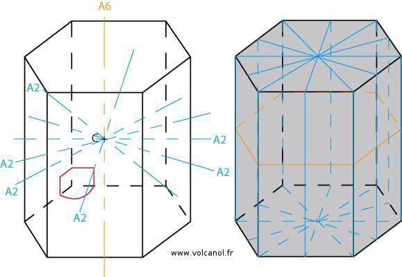Axe de symétrie (A) : Une droite est un axe de symétrie d’ordre n lorsqu’il est possible de faire tourner la figure géométrique autour de cette droite d’un angle équivalant à 360° et que la figure se retrouve confondue avec elle-même. En minéralogie, on rencontre des axes d’ordre 2, 3, 4 et 6.